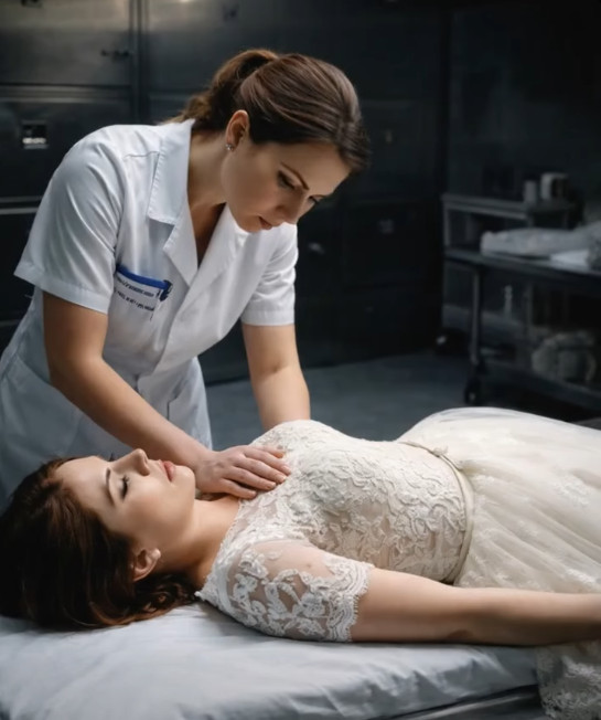 Sanitarka koja je nedavno započela svoj posao osjeća da nešto nije u redu. Njene sumnje postaju sve jače kada čuje ritam srca mlade. Ova scena, koja na prvi pogled može izgledati kao rezultat stresne situacije, za sanitarku postaje znak za uzbunu. U svijetu gdje se život i smrt često miješaju, njen instinkt je ključan. Doktor, zajedno s mladoženjom, manipulira situacijom kako bi prikrio istinu. Njihova motivacija leži u novcu, ljubavi i imovini — mlada, predstavljena kao mrtva, postaje ključ za otvaranje vrata nasljedstva. Ova prevara ne uključuje samo individualne interese, već i širu društvenu dinamiku koja se bavi pitanjima etike i morala.